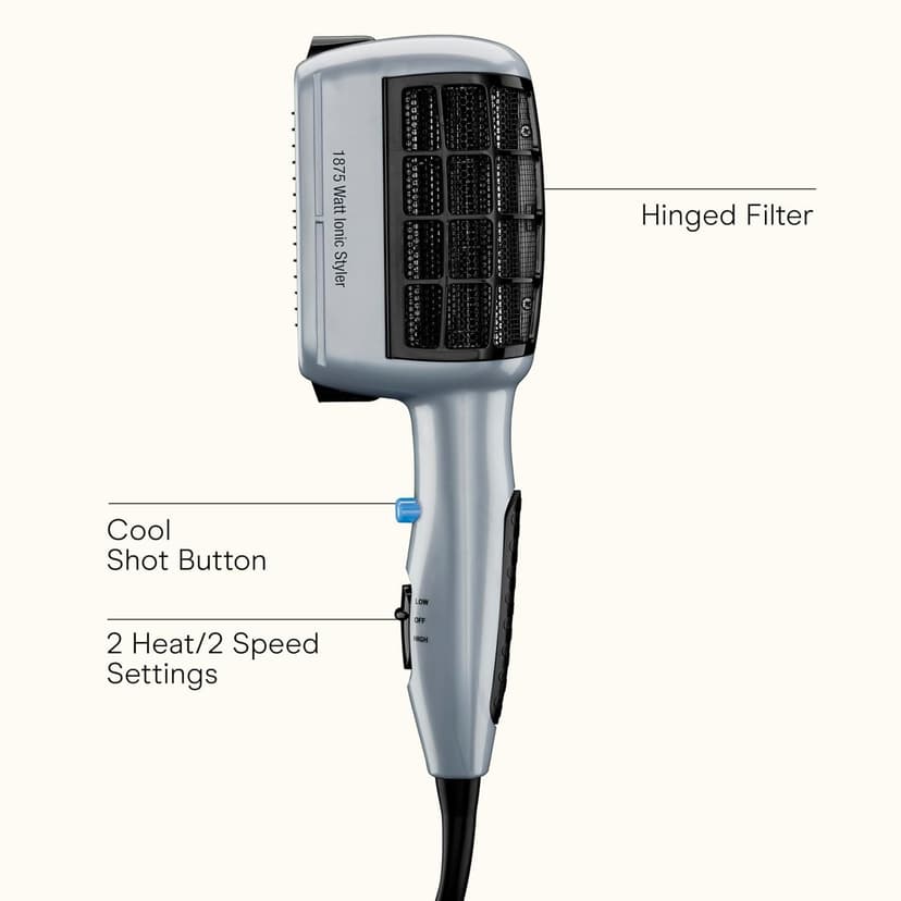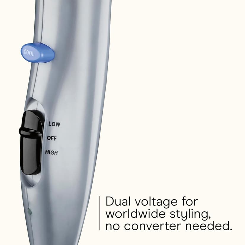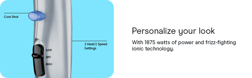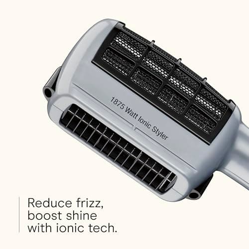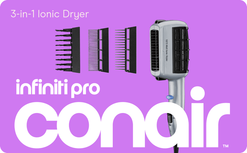 Product Description Change it up! The innovative Conair 3-in-1 Styling Hair Dryer lets you explore endless looks with less damage and frizz and more shine. This hair blow dryer includes 3 unique attachments for personalized results, including a thermal bristle brush for volume and waves, styling comb for straight styling, and detangling comb. For healthier-looking hair, this blow dryer with attachments features ionic technology that ensures up to 75% less frizz compared to hair dryers with natural ion generation for smooth shine. Choose from 2 heat/speed settings with attachments for greater styling control. The hinged filter prevents damaging lint buildup for extended motor life, and the dual voltage design provides worldwide travel convenience. Brand Story By