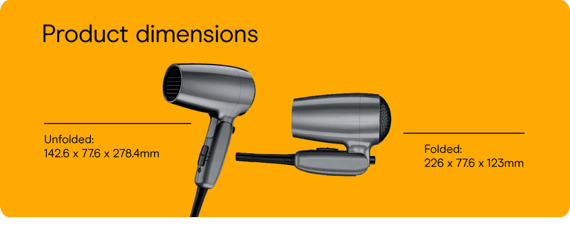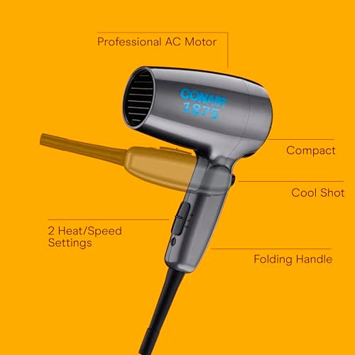 TThe Conair® Hair Dryer with Folding Handle is the ultimate travel companion, featuring a foldable design for easy storage and portability. This powerful and lightweight hair dryer is equipped with an 1875W motor that reduces frizz and heat damage while delivering smooth, shiny results. This blow dryer offers 2 heat/speed settings for customizable airflow and a cool shot button to lock in your style. Dual voltage lets you take this travel hair dryer anywhere in the world, giving you quick-dry ease and salon-quality results wherever you go.