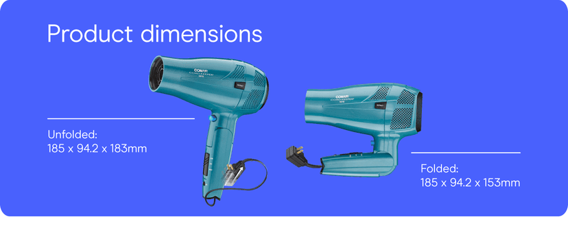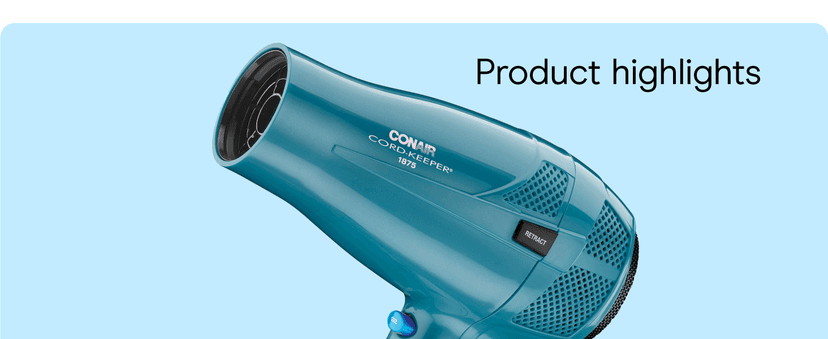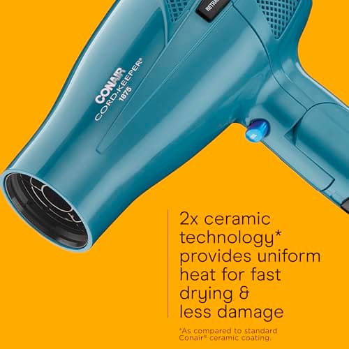 The Conair 1875 Watt Ionic Conditioning Cord-Keeper Hair Dryer with Folding Handle in Teal has a cord which retracts at the push of a button for easy storage. Keep things tidy and tangle-free with this 1875 Watt Hair Dryer. The folding handle is perfect for easy packing, compact storage and jet-setting travel. This powerful and lightweight hair dryer has Ionic Conditioning for smooth, shiny-looking hair and less frizz. The Tourmaline Ceramic Technology in this dryer for hair produces infrared heat, which gently dries hair quickly while ultimately reducing heat damage. 2 heat/speed settings for custom air flow and a Cool Shot locks style in place. In addition to the folding handle and retractable cord, this dryer is Dual Voltage, which makes this hair dryer excellent for worldwide travel. Dual voltage and the folding handle make this styler an ideal travel companion. Refer instruction manual before use.