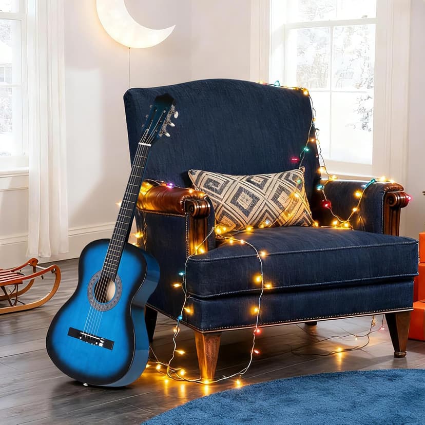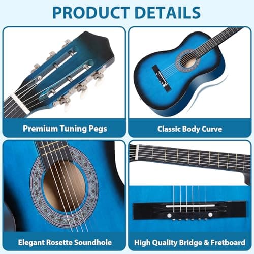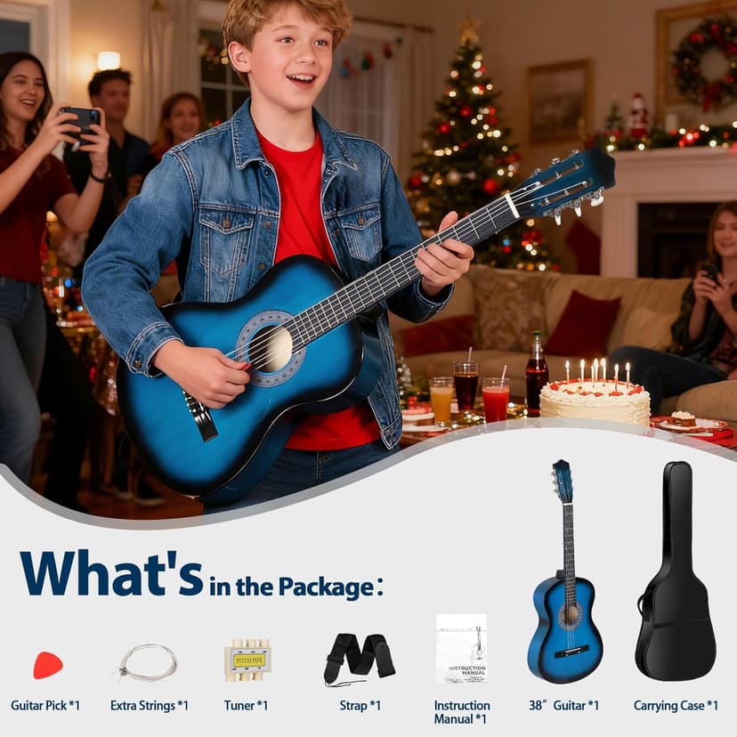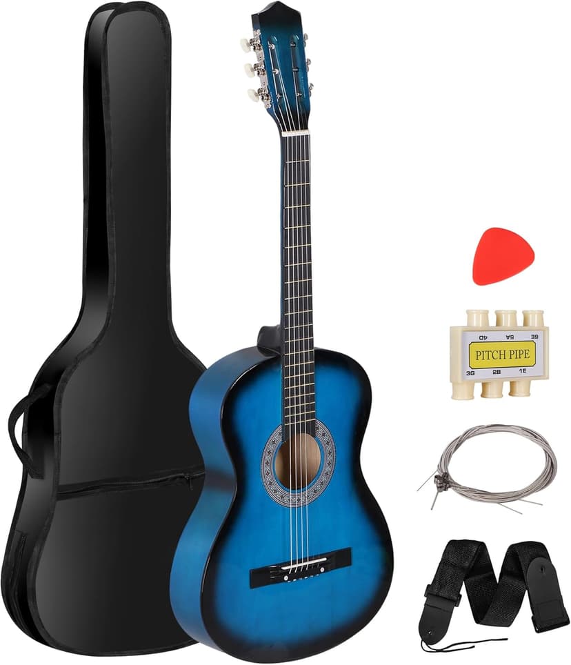 Learning how to play the acoustic guitar is one of the best lifestyle choices you could make, and an excellent instrument to dedicate your time to – one that can lead to wonderful things.To learn the instrument, as a beginner on a budget, buying something expensive is not necessary. Instead, it's worth opting for a beginner's guitar or a convenient and affordable combo pack. Smartxchoices starter kit contains everything you need to get you up and playing instantly at a price anyone can afford. Note: Please being careful to not over tighten any of the strings while doing so, and be patient. Once through all the strings, start back at the top and do it again - new strings will take several tunings over a period of at least a day or two before they are taught and can hold their tone.Features:-It comes un-tuned so be prepared to tune it.-The strings are strong and sturdy and made of steel. -The pitch pipe is very easy to use and doesn't require any batteries.-Easiest and cheapest way to satisfy a child that states they want to learn to play the guitar this week and then they move on to something else the following week.SPECIFICATIONS:Guitar Dimensions: 38"(L) x 14"(W) x 3.25"(H)Weight: 4.7 lbsMaterial: WoodCase Material: NylonColor: Black/Blue/Pink/NaturalIncludes a carrying case, guitar pick, pitch pipe, a shoulder strap, and an extra set of stringsDEAR CUSTOMER:Our goal is to provide all music lovers the best experience when it comes to guitars. We are continually evolving and inspired to create new instruments that cater to diverse musical genres. We work directly with our manufacturers to produce high-quality musical instruments for beginners and experts. Our target is to provide musical kits, with the best value available online, without sacrificing quality.We committed to providing only the best and highest level of service.