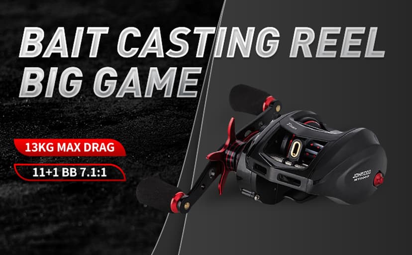 JOHNCOO Bait Casting Reel Big Game 13kgs Max Drag Saltwater Fishing Reel Light Weight 11+1 BB 7.1:1 Aluminium Alloy Body for Big Fish Low Profile baitcast Reel CNC Machined Aluminum spool Aluminum Body and Graphite side Covers Clicker system for the Action Adjusting Precision machined brass gear Could used for saltwater and freshwater