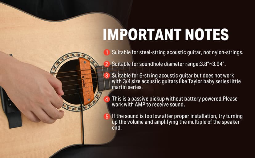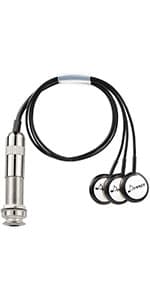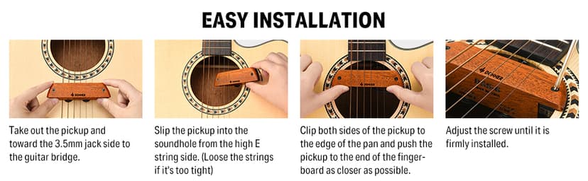 Specification: Pickup Theory: Cutting Magnetic Lines Pickup Type: Humbucking Passive Housing: SOLID Mahogany Housing Connection Method: 64cm instrument cable with 3.5mm and 6.35mm jacks Fit Minimum Soundhole Diameter: 3.8” (96.6 mm)