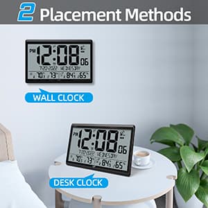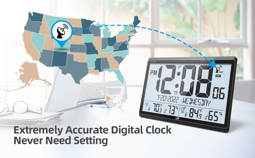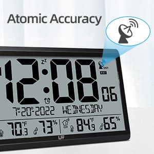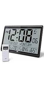 GREAT OBJECT IDEA With beautiful packaging, good design and a variety of great features, this digital wall clock is the perfect object for parents, friends, heavy sleepers or light sleepers. The perfect object for Thanksgiving, Christmas, Birthdays and more. Clock size: 14.2''×9.4''×1.2''.Automatically update daylight saving time (on/off option).Atomic clock with big numbers, making it easier for family members to know the time, date,week, indoor / outdoor temperature and humidity.8 time zones to choose from: EST, CST, MST, PST, AKT, HST, AST,NST.The outdoor sensor can wirelessly receive the transmission signal within a range of 328 feet.The large atomic clock can be used as a atomic wall clock or as a desktop atomic clock. Battery powered: Clock 4 AA batteries (not included), Sensor 2 AAA batteries (not included).