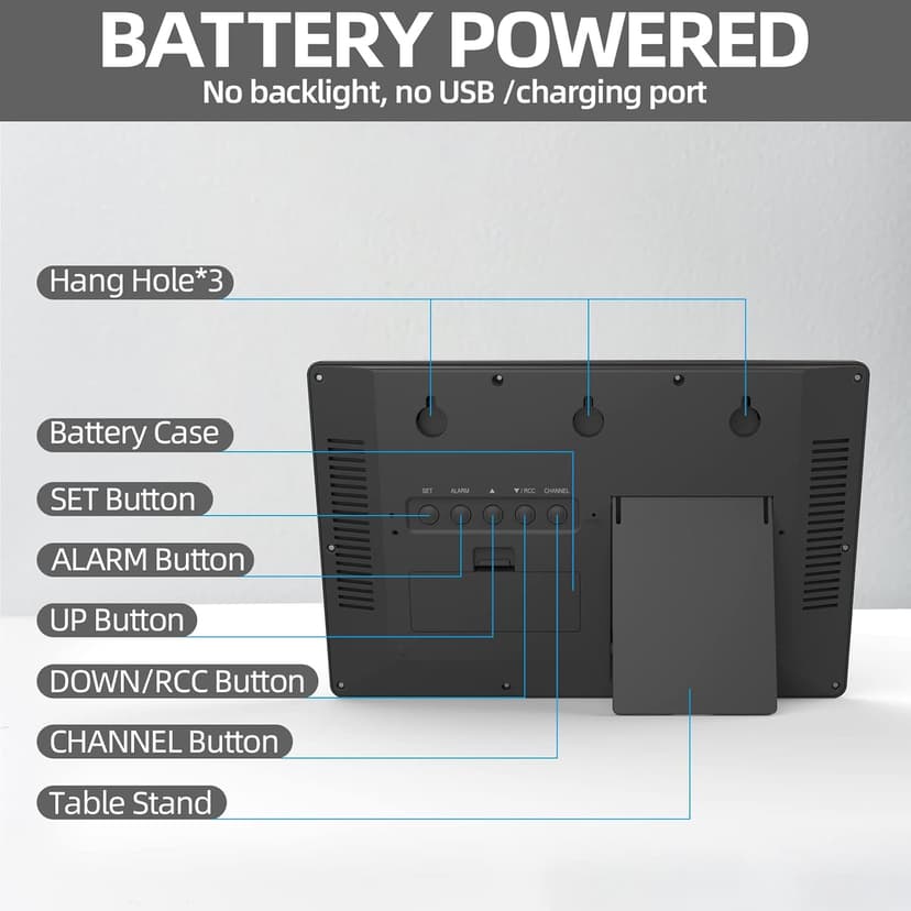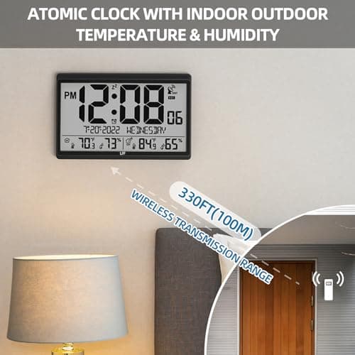 GREAT OBJECT IDEA With beautiful packaging, good design and a variety of great features, this digital wall clock is the perfect object for parents, friends, heavy sleepers or light sleepers. The perfect object for Thanksgiving, Christmas, Birthdays and more. Clock size: 14.2''×9.4''×1.2''.Automatically update daylight saving time (on/off option).Atomic clock with big numbers, making it easier for family members to know the time, date,week, indoor / outdoor temperature and humidity.8 time zones to choose from: EST, CST, MST, PST, AKT, HST, AST,NST.The outdoor sensor can wirelessly receive the transmission signal within a range of 328 feet.The large atomic clock can be used as a atomic wall clock or as a desktop atomic clock. Battery powered: Clock 4 AA batteries (not included), Sensor 2 AAA batteries (not included).