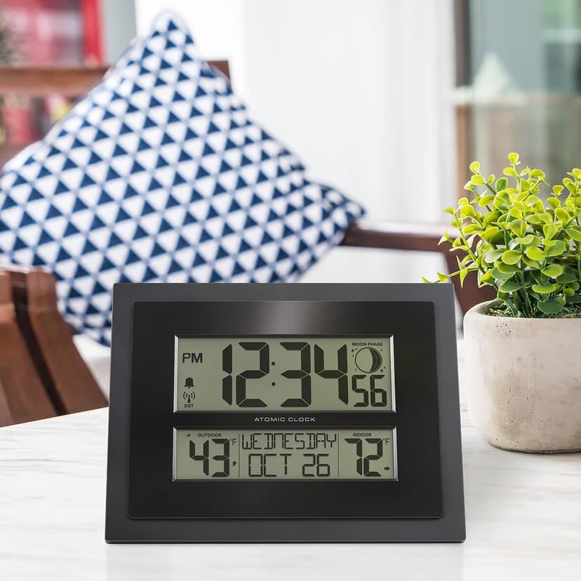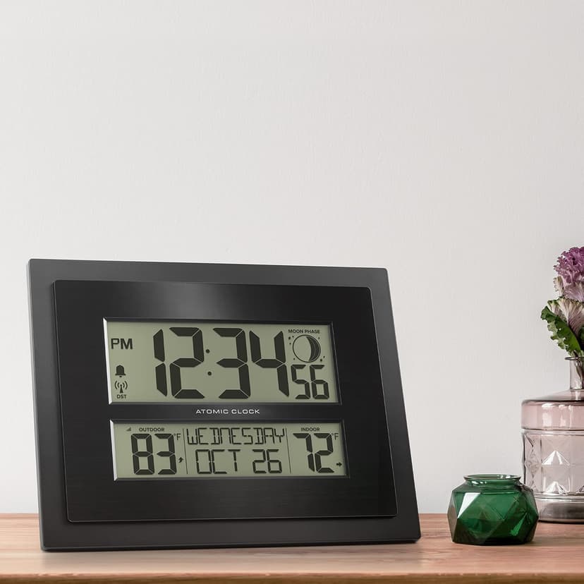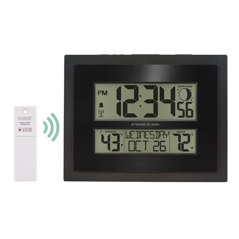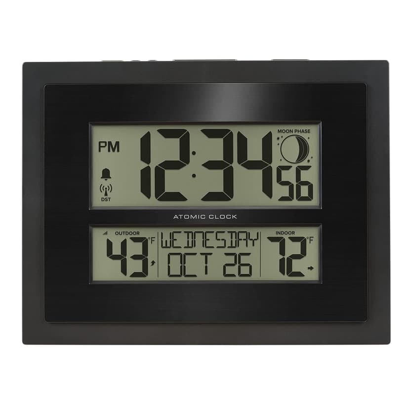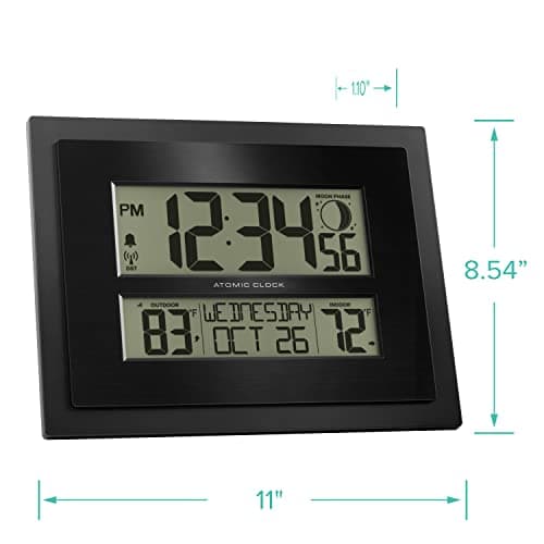 Be ready for the day with the Atomic Digital Clock with Moon phase and Temperature. This clock comes with important features to provide information you need to know. The atomic clock wirelessly gives you the current outdoor temperature, so you know whether you'll need a coat or able to wear flip-flops. It self-sets the time and date to the Atomic signal for the best accuracy and will automatically reset for Daylight Savings' time. The self setting clock is battery operated, so it will keep precise time even during black outs or power surges. Its classic design is suited for home or office and features a time alarm with ten-minute snooze option. The clock displays in either 12 or 24 hour mode and adjustable in 7 different time zones. Temperatures can read in either Fahrenheit or Celsius and modifiable language settings in either English, Spanish, or French. This elegant simplified wall clock gives you the ability to be prepared for almost anything. Optional mounting to place onto a desk or hang onto your wall.