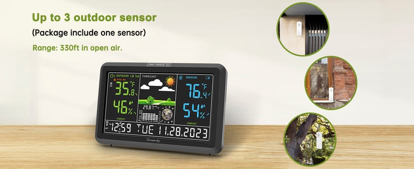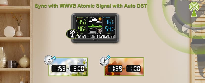 | Special Feature | Home Weather Station with Indoor Outdoor Thermometer Wireless, Colorful Large Display with Adjustable Backlight, WWVB Digital Atomic Clock with Auto DST, Customizable Temperature Alerts, Max/Min Temp Humidity Records, Adapter Powered with Battery Backup, USB Charging Port See more |