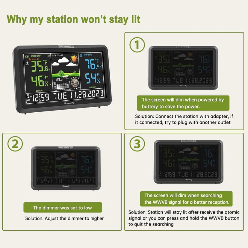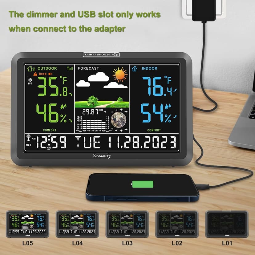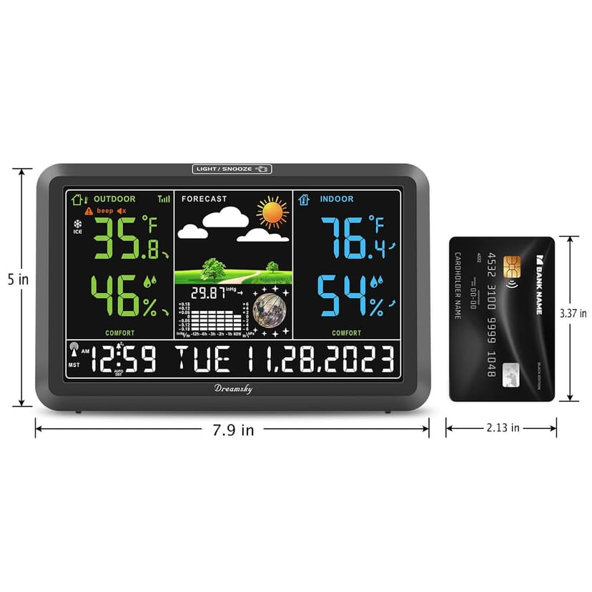| Special Feature | Home Weather Station with Indoor Outdoor Thermometer Wireless, Colorful Large Display with Adjustable Backlight, WWVB Digital Atomic Clock with Auto DST, Customizable Temperature Alerts, Max/Min Temp Humidity Records, Adapter Powered with Battery Backup, USB Charging Port See more |