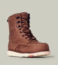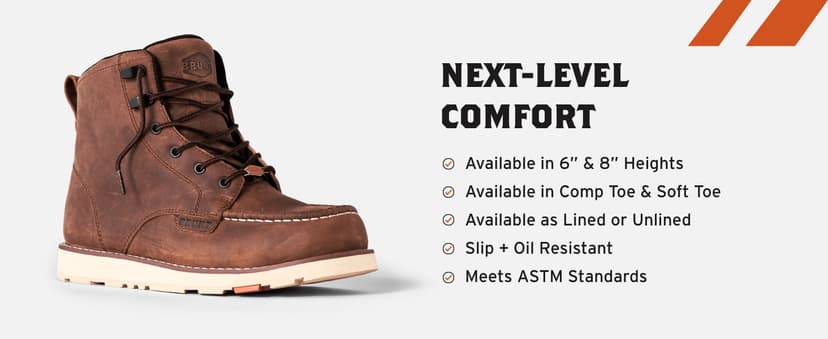 Ideal for tradespeople, the Marin 8" Soft Toe excels from greasy workshop floors to muddy farmlands. Our top-seller boasts an 8" height for enhanced ankle support and safeguards against sparks, mud, and moisture. Equipped with a breathable, waterproof membrane and leather, it keeps feet dry. The BRUNT rubber outsole resists oil, slips, and high heat up to 572F/300C, featuring electrical hazard protection. Additionally, it sports waterproof, barnyard-resistant FARMGUARD leather, shielding against rain, mud, oil, and more. All BRUNT leather hails from USA Texas steer, ensuring premium quality.