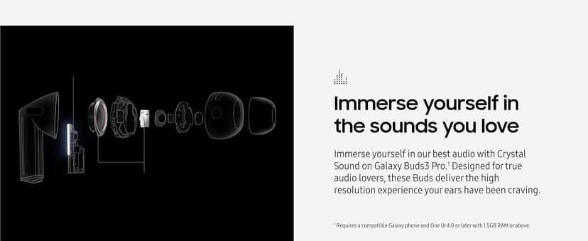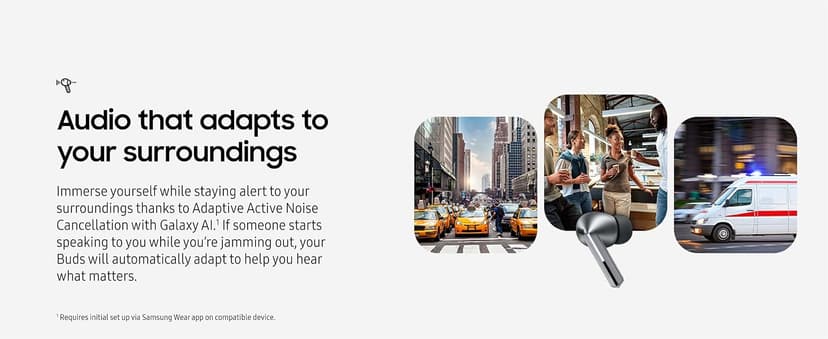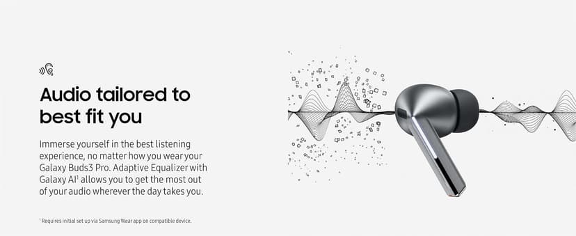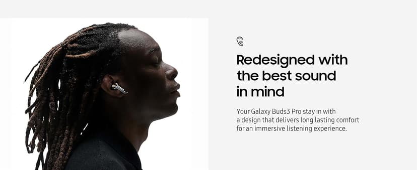 Meet the new shape of sound — Galaxy Buds3 Pro — now completely redesigned with improved hardware to bring you deeper into the audio than ever before. With Galaxy AI¹, your Buds create the best listening experience by optimizing sound based on your surroundings and how you wear them — while providing a snug fit for all-day comfort, no matter what you do. Buds3 Pro get how much you love your audio. From jamming while cooking to listening to your favorite show on a crowded subway to taking a work call, your Buds will adjust to the different sounds around you using Adaptive Active Noise Cancellation so you always hear what’s important. Plus, they’re packed with features to create a convenient listening experience — from auto-switching⁴ your audio between your Galaxy phone and your Galaxy PC to immersing you in the latest TV shows with 360 Audio, now available on Samsung TVs. And it doesn’t stop there — Buds make perfect companions for your Galaxy phone as you travel. Real-Time Interpreter with Galaxy AI³ allows you to speak like a local as your phone translates speech right in your Buds so you never miss a word from your local tour guide. No matter what you listen to or how you listen, we’ve redesigned our Buds to give you the most immersive audio experience with Galaxy Buds3 Pro. ¹Requires a compatible Galaxy phone and One UI 4.0 or later with 1.5GB RAM or above. ²Requires initial set up via Samsung Wear app on compatible device. ³Requires compatible Galaxy device. Samsung account login and language preset (English and Spanish pre-installed; other languages require free download). Results may vary. ⁴IP-rated for submersion in up to 3 feet of fresh water for up to 30 minutes (charging case is not water-resistant). If the earbuds or your hands are wet, they must be dried thoroughly prior to handling. ⁵Available only on products sold by and shipped from Amazon.