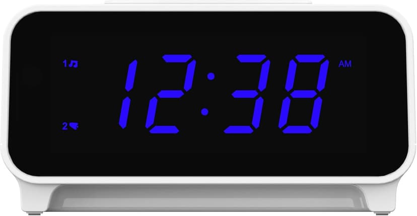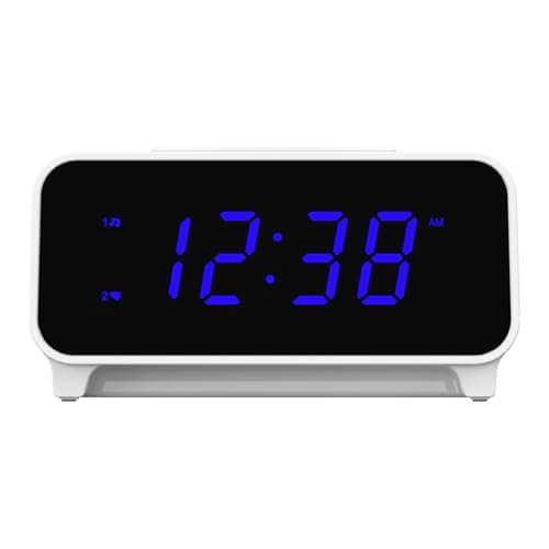 Start every morning on time and in style with the Emerson CKS1500 SmartSet Dual Alarm Clock Radio, designed for simplicity, accuracy, and a modern aesthetic. Featuring Emerson’s patented SmartSet technology, this clock automatically sets the year, month, date, day, and time the moment you plug it in—and re-adjusts after any power loss. It even automatically adjusts for Daylight Saving Time. The 0.9” blue LED display is crisp and easy to read, while the 4-level dimmer lets you customize brightness to your comfort. Set dual alarms to wake to either a buzzer or your favorite AM/FM station, with up to 20 station memory presets for instant tuning. A programmable sleep timer, repeat snooze, and digital volume control add functionality and convenience. Beyond the numbers, the CKS1500 features two levels of blue LED accent lighting, giving your nightstand a warm, ambient glow. The unit’s compact footprint (4.73” W x 3.15” D x 2.36” H) and integrated AM/FM antennas make it a perfect fit for bedrooms, dorms, and offices alike. With a non-detachable AC power supply and an included button cell backup battery, this Emerson clock is always ready—just plug in and go.