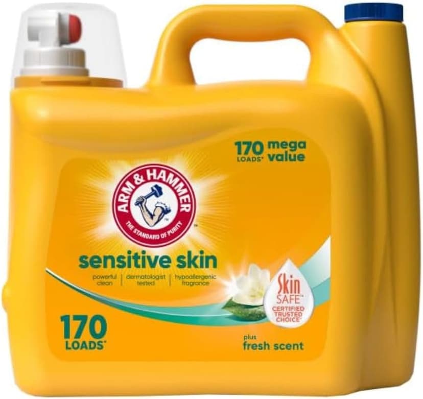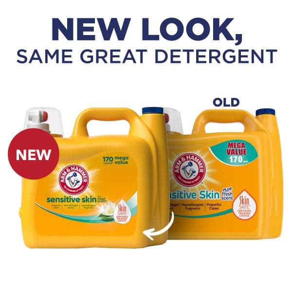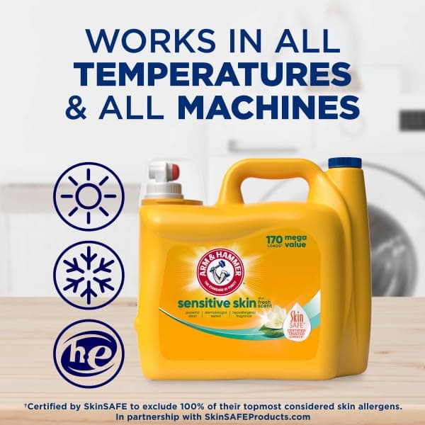 ARM & HAMMER Sensitive Skin Liquid Laundry Detergent is gentle on skin, but powerful on dirt. This HE laundry detergent liquid is concentrated with 2X powerful stain fighters in every load vs the leading value detergent, so it’s powerful enough to handle your toughest loads in all wash temperatures, even cold water. This laundry soap keeps laundry smelling fresh without irritating sensitive skin with a hypoallergenic, skin-friendly fresh scent that has been dermatologist-tested and passed four different clinical tests. This dye-free liquid laundry detergent is designed to work in standard and HE machines.