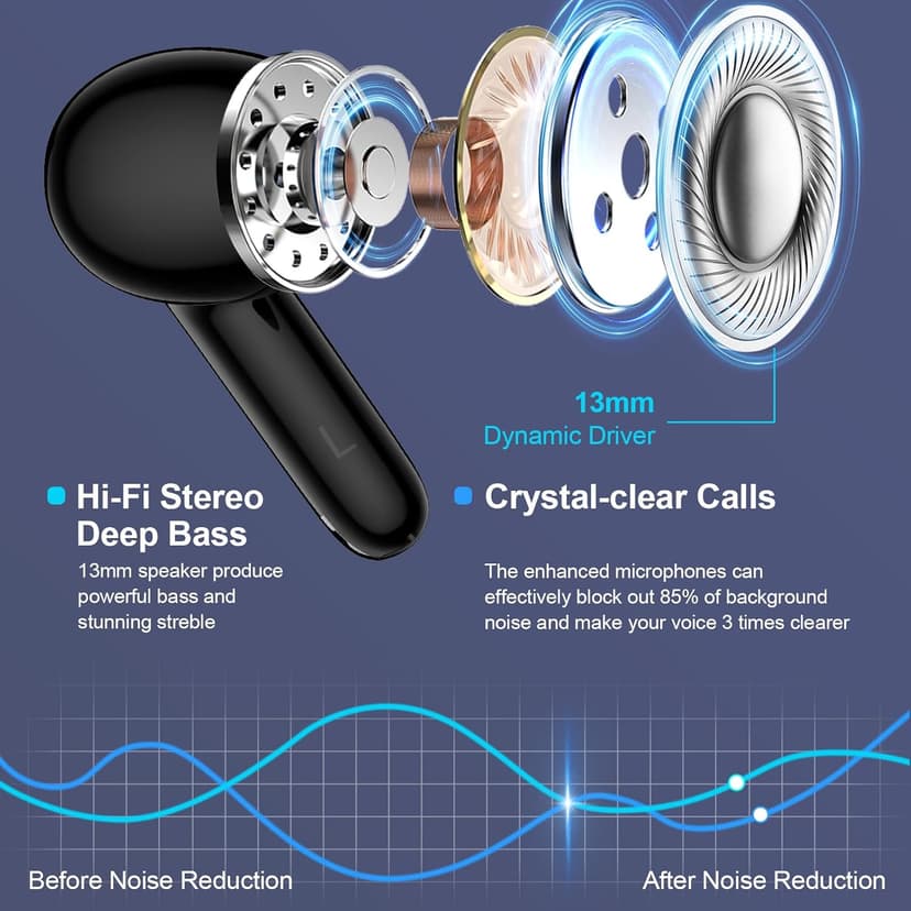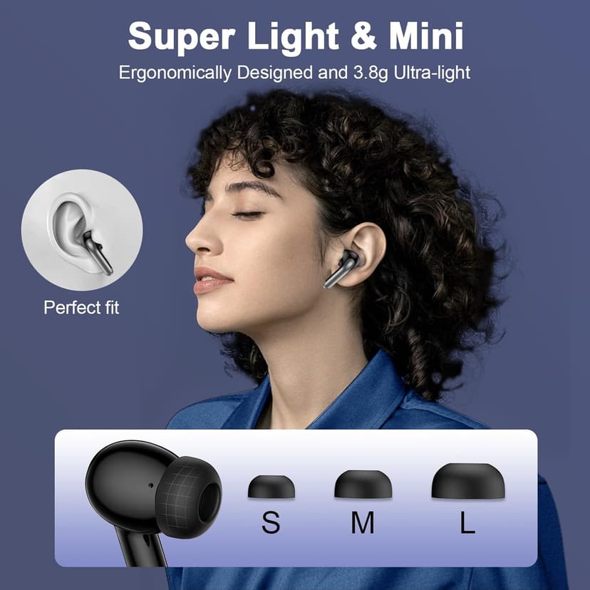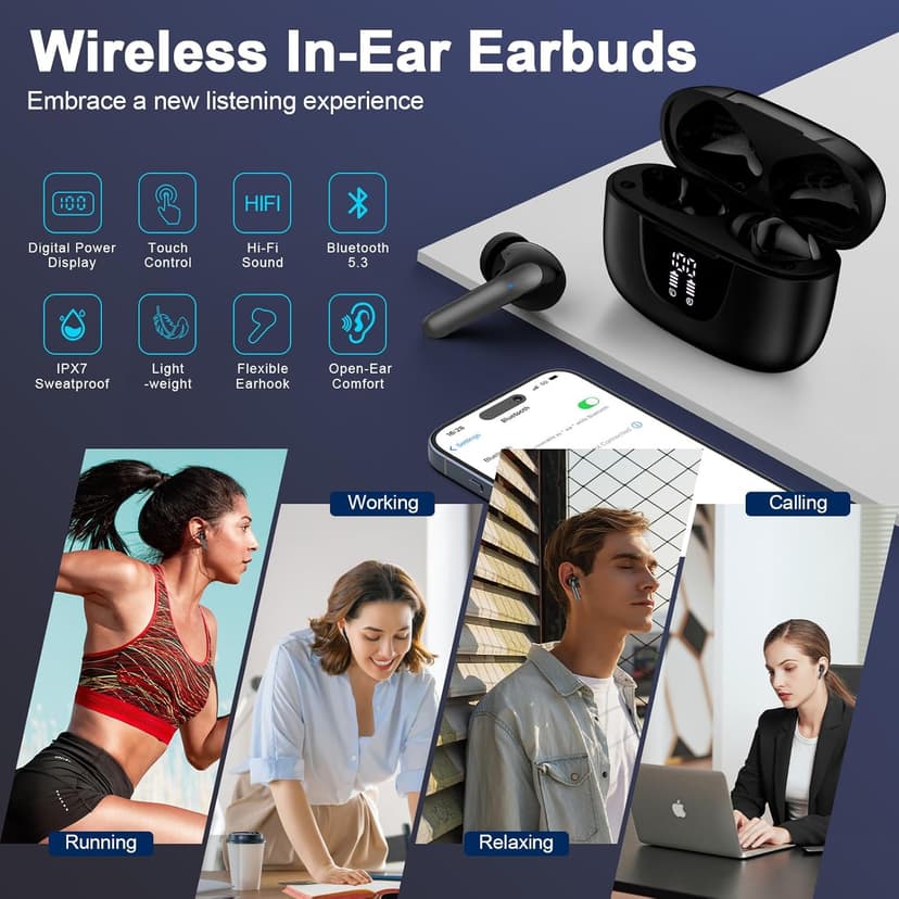 Bluetooth 5.3 Headphones Wireless Earbuds 60H Playback Deep Bass Stereo Ear Buds with LED Power Display Wireless ear buds are compatible with most Bluetooth-enabled devices, including android phones,iPhone/Samsung/Google series and computer/Laptop/TV etc. Bluetooth V5.3 Headphones Bluetooth 5.3 technology brings you a more stable and faster connection, and the connection distance can reach up to 100ft. Whether you're watching movies or playing games, it always provides a stable, zero-lag wireless connection with high-quality sound. Smart Touch Controls Sensitive touch controls operate the headset with just a tap of your finger. Answer or hang up calls, pause or play and more! IPX7 Waterproof The nano-coating on the surface of the earbuds can prevent rain and sweat and can be used during high-intensity running and exercise. Comfortable for a Long Time The earbuds are ergonomic and come with 3 size ear caps for long-term wear without stress. (M is installed on the earbuds, S & L are included in the packing box). perfect for workouts/runing/gym/sports/outdoor activities/yoga/biking/driving/bending/jumping/farming etc. What's in the box in-Ear Bluetooth Earbuds*2(L,R) Fast Charging Case*1 Pairs of Earplugs (S, M, L)*3 USB-C Charging Cable*1 Instruction Manua*1