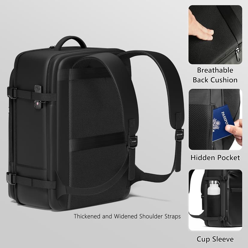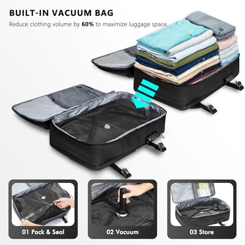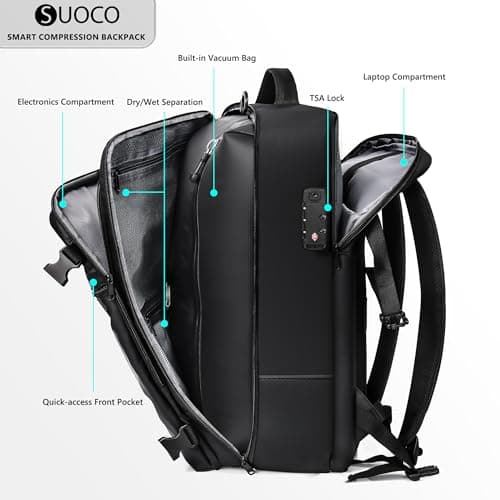 Vacuum Backpack for Travel: The SUOCO Backpack features a built-in vacuum-compression bag that allows you to pack up to 60 liters of clothing—far more than a 20-inch carry-on can hold. This breakthrough in travel convenience and storage efficiency lets you fit maximum capacity into a compact form, so you never have to compromise on what to bring. A wireless electric travel pump is included to compress everything in just 10 seconds.