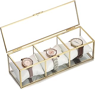 JUXYES JUXYES Clear Glass Watch Display Case with 3 Slots, Luxury Brass Glass Watch Organizer Holder Stand with White Watch Pillow, Modern Transparent Watch Collection Box for Men and Women, Gold
